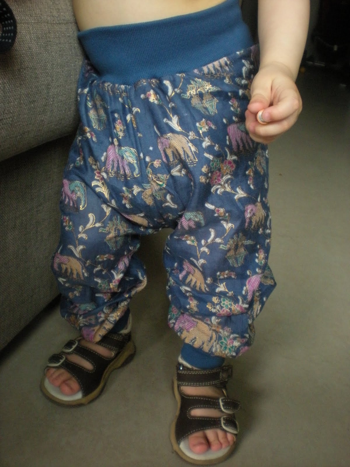 Ja tässä malli esittelee kesämuotia 2010, kyseessä ohuenohuet hellehousut. Materiaalina 0€:lla hankitut rikkinäiset jättikokoiset hellehousut. Kuosina intialainen norsu. Vyötäröllä ja lahkeissa käytettävyyttä lisäävät riittävän tiukat resorit. Takana pyllykiila, jotta kestovaipat mahtuvat hyvin mukaan.